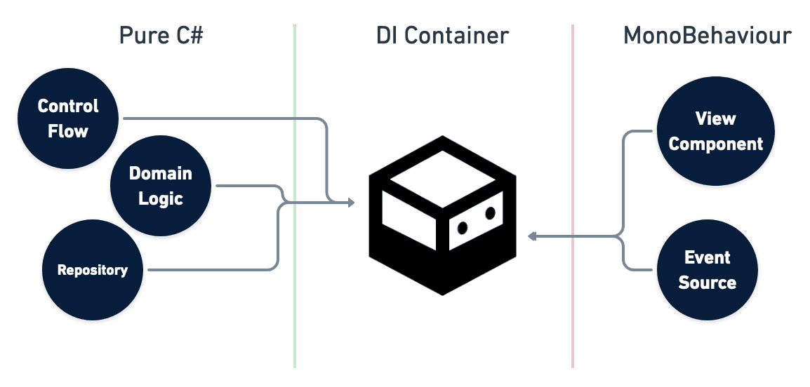 DI containers we can make pure C # classes the entry point (not MonoBehaviour). This means that the control flow and other domain logic can be separated from the function of MonoBehaviour as a view component.